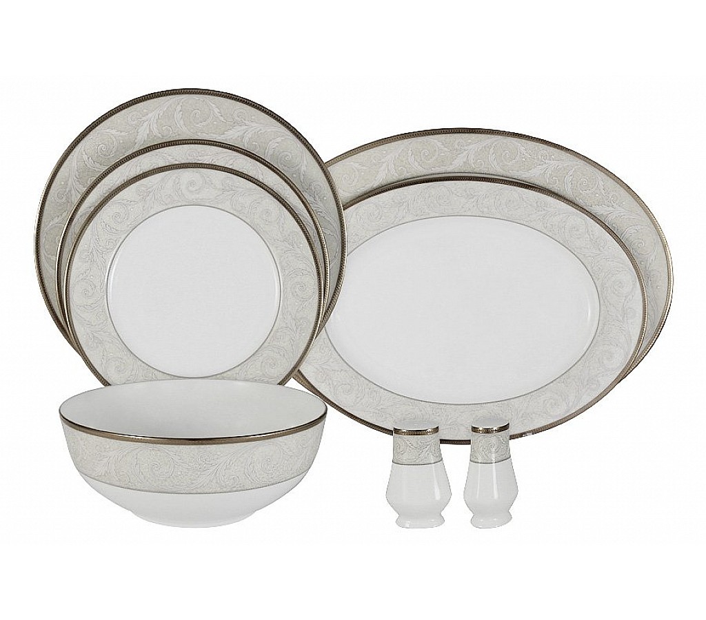 Белоснежный костяной фарфор уже и сам по себе является признаком хорошего вкуса, отражая любовь к качественным элитным изделиям.А то, что он еще и украшен очень нежным орнаментом серебристого цвета лишь добавляет ему еще больше утонченности и особого шарма. В сервизе 23 предмета, каждый из которых отличается хорошей прочностью и стойкостью рисунка, потому его можно использовать как для повседневной жизни, так и для праздников, не переживая по поводу «истирания» при использовании моющих и чистящих средств.