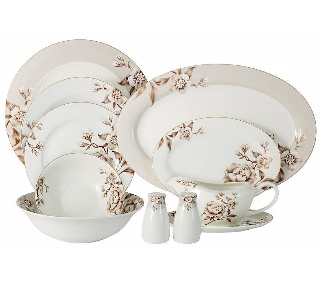 Обеденный сервиз 27 предметов на 6 персон Стефания 6 закус тарелок 21см, 6 суп тарелок 21см, 6 обед.тарелок 27см, 2 салатника 16см, 1 салатник 23см, 1 блюдо 23см, 1 блюдо 37см, соусник 0,42л на блюдце, солонка, перечница
