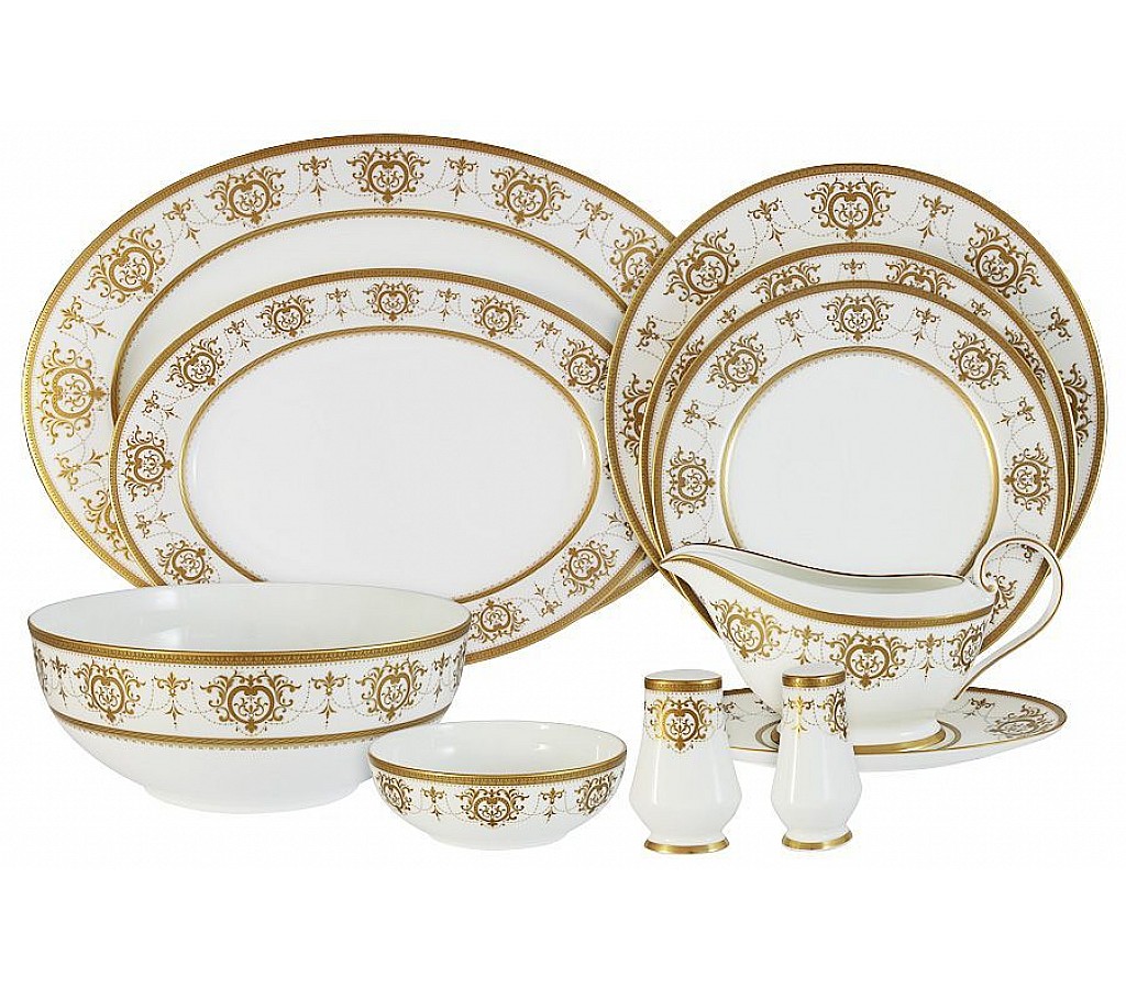 Обеденный сервиз 28 предметов на 6 персон Тиара Голд. Состав сервиза: 6 тарелок 27 см, 6 тарелок 23 см, 6 тарелок 21 см, 2 салатника 13 см, 1салатник 22 см, 1 блюдо 43 см, 2 блюда 32 см, соусник, блюдо д/соусника, солонка, перечница