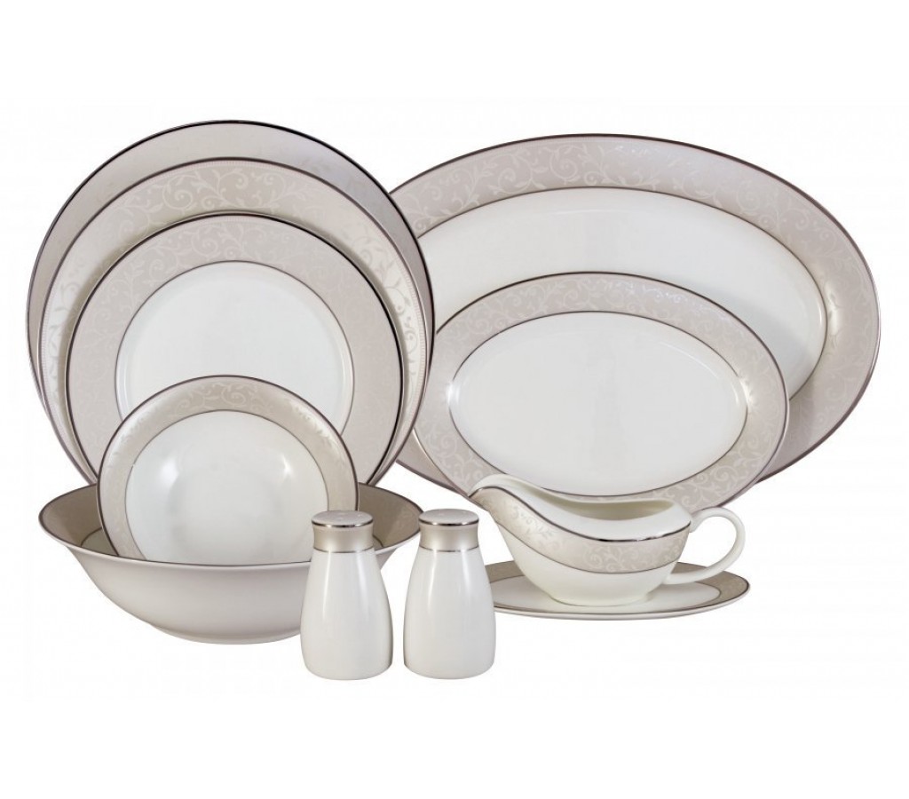 В набор входит 50 предметов, с помощью которых можно сервировать стол на 12 персон. Несколько видов тарелок, блюда, салатницы, наборы для специй и соусницы можно дополнить красивыми белыми вазами с живыми цветами и скатертью теплых оттенков. Этого будет достаточно для того, чтобы создать праздничную атмосферу, не заботиться о поиске дополнительных емкостей и оформить стол по всем правилам классического декора.
