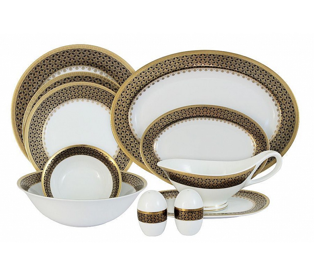 47036 Обеденный сервиз Чёрное золото 27 предметов на 6 персон 6 закус тарелок 20,5см, 6 обед тарелок 27см, 6 суп тарелок 22см, 2 салатника 14см, 1 салатник 23см , 1 блюдо 35см, 1 блюдо 23см, соусник на блюдце, солонка, перечница