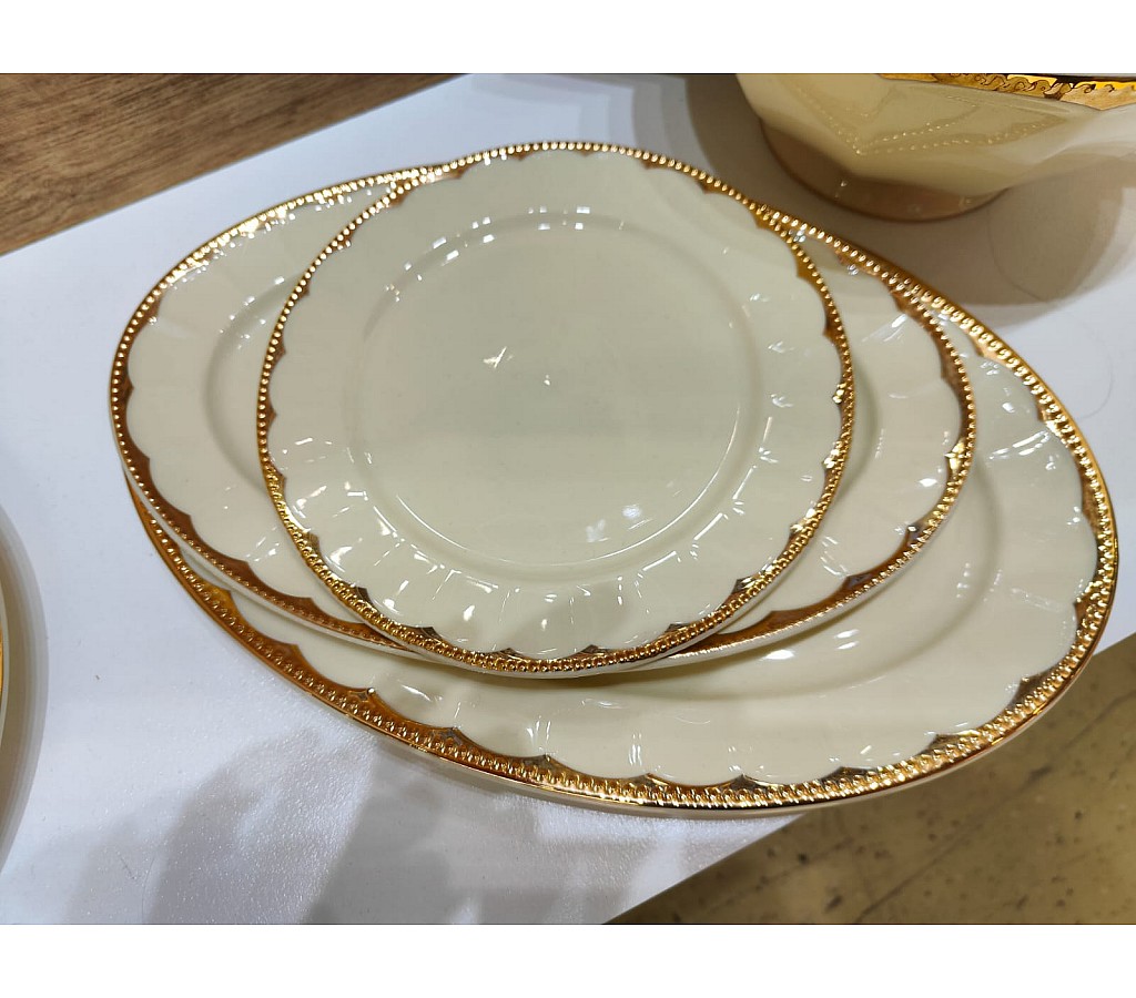 Коллекция фарфоровой посуды Империал золото кремовый невероятно торжественна и утонченна. Отделка золотом создает вневременное и романтическое очарование, которое нравится людям всех возрастов. Посуду можно использовать для повседневного ужина, особых случаев или в качестве декоративного предмета.. Сервизы и наборы упакованы в подарочные коробки.