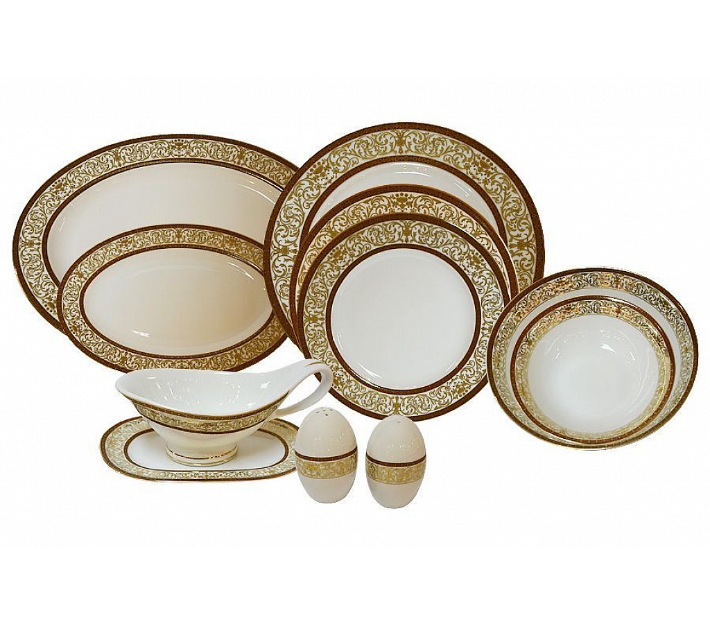 45144 Обеденный сервиз Мадлен 27 предметов на 6 персон. Состав сервиза: 6 закусочных тарелок 20,5см, 6 обеденных тарелок 27см, 6 суповых тарелок 22см, 2 салатника 14см, 1 салатник 23см, 1 блюдо 35см, 1 блюдо 23см, соусник на блюдце, солонка, перечница