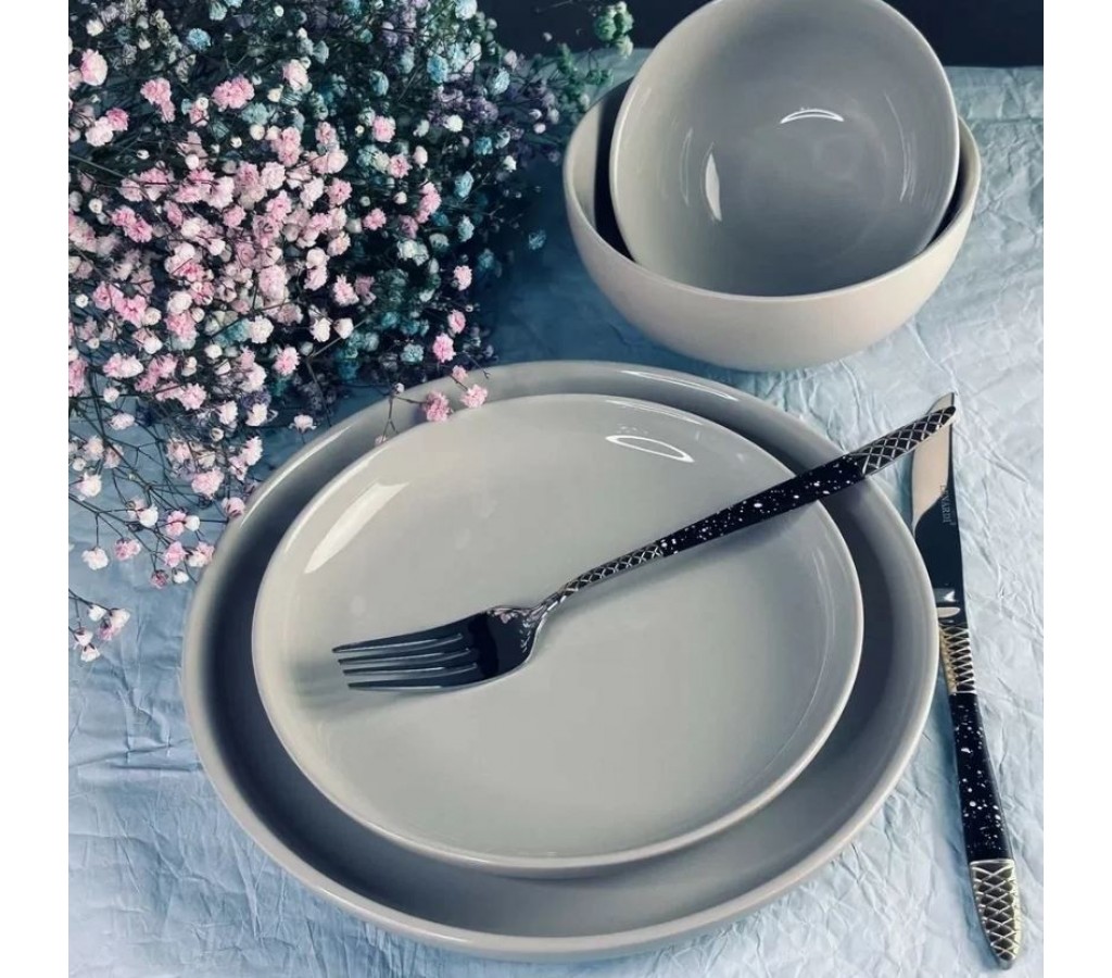 Обеденный сервиз на 6 персон 24 предмета серый изготовлен из прочного и долговечного фарфора. Практичная и незаменимая посуда для каждодневного применения так как ее можно мыть в любом режиме в посудомоечной машине и использовать в СВЧ печи.Набор упакован в подарочную коробку.Комплектация: