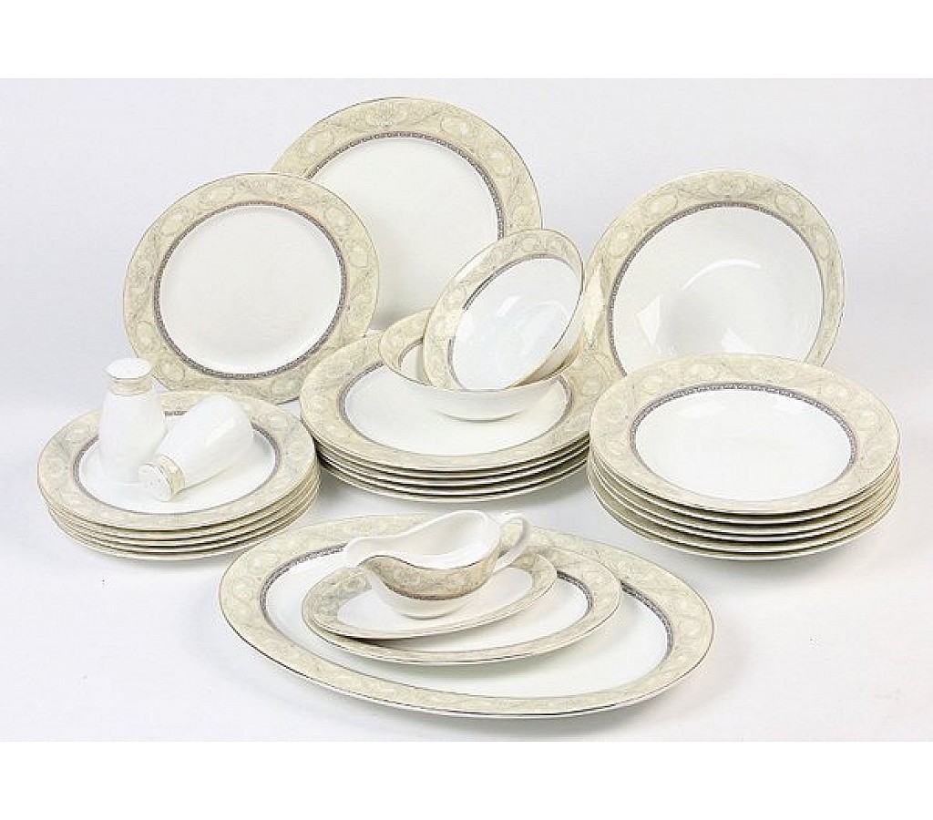 Обеденный сервиз Романтика 27 предметов на 6 персон 6 обед.тарелок 25,5см, 6 суп.тарелок 23см, 6 закус.тарелок 21см, 1 салатник 23см, 2 салатника 16,5см, 1 блюдо 36,5см ,1 блюдо 23,5 см, соусник+блюдо под него, набор для специй
