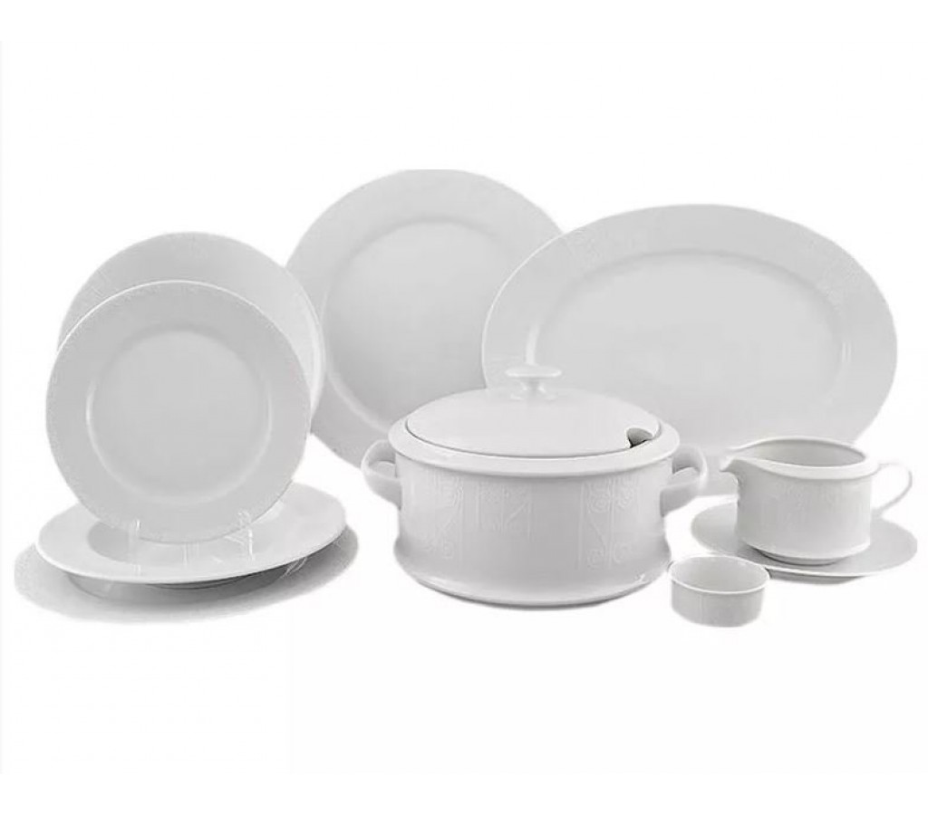 Столовый сервиз Сабина Белый орнамент известной марки Leander выполнен из высококачественного прочного чешского фарфора. Белоснежный дизайн предметов сервиза является воплощением строгой классики, который отлично дополняет замысловатый белый узор. Сервиз рассчитан на 6 персон, содержит 25 предметов, подходит как для ежедневного использования, так и для проведения торжественных мероприятий.