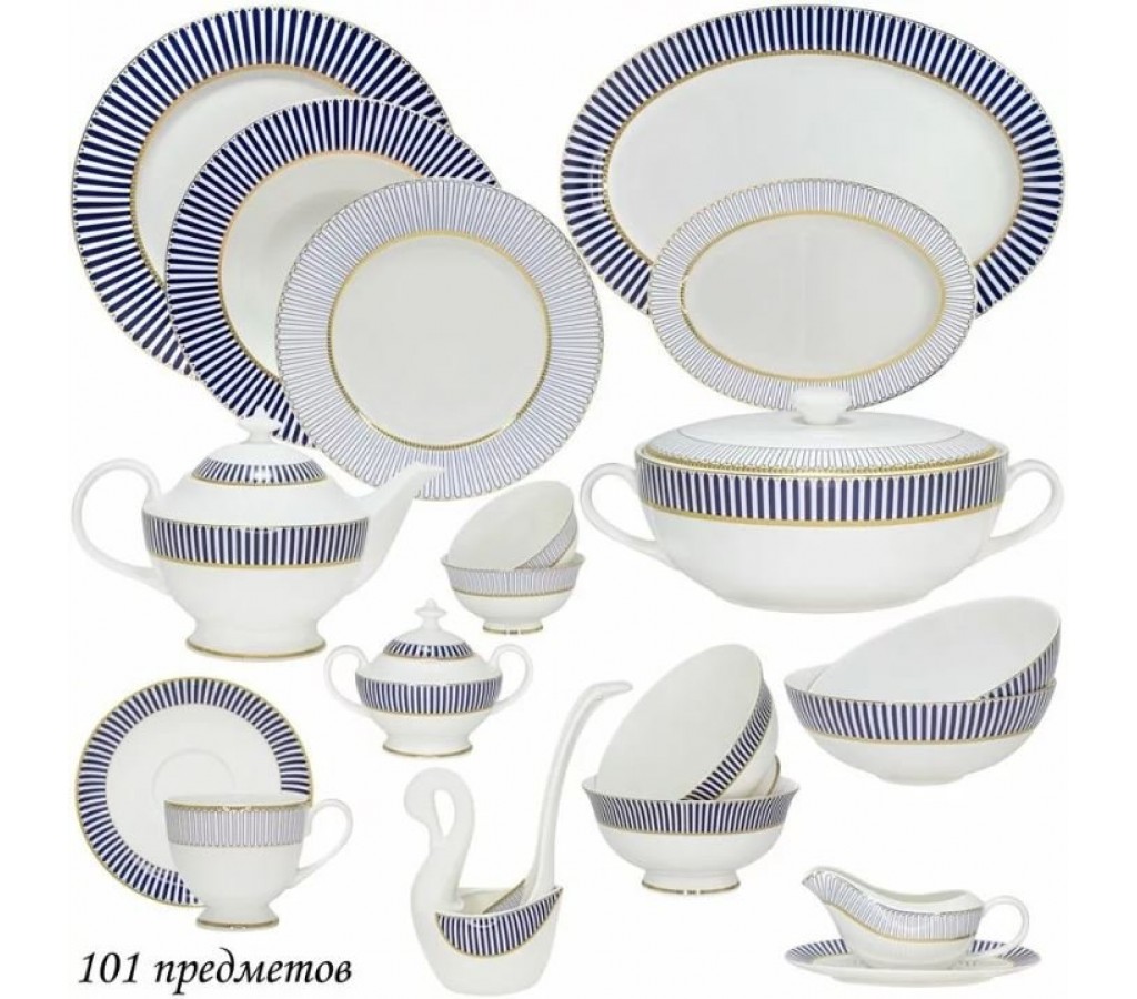Столово-чайный сервиз Инфанта Lenardi на 12 персон 101 предмет изготовлен из тончайшего костяного фарфора. Посуду отличает лаконичный декор в морском стиле, в сочетании с золотой окантовкой. Легкий, прочный и долговечный фарфор. Упакован в подарочную коробку.