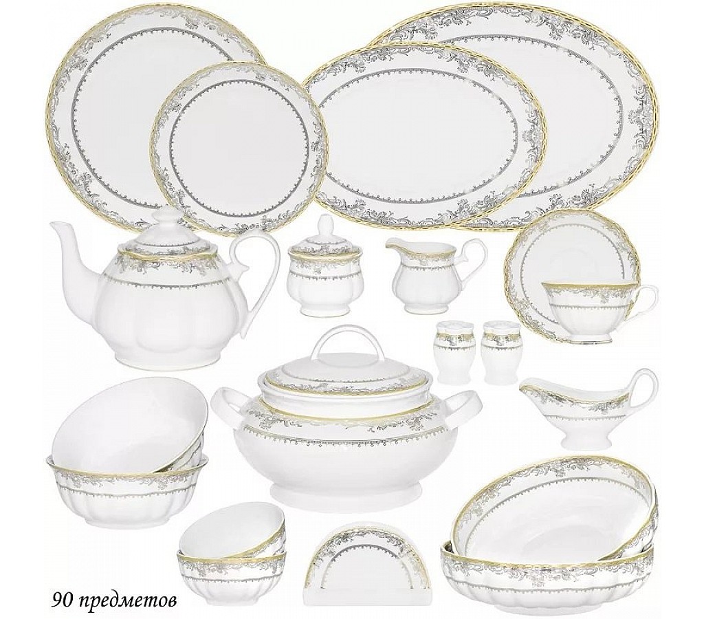 Столово-чайный сервиз Исидора Lenardi на 12 персон 90 предметов включает 3 вида тарелок по 12 штук, чайные пары 12 штук, блюда и салатники. Рекомендуется мыть руками. Не использовать в микроволновой печи.