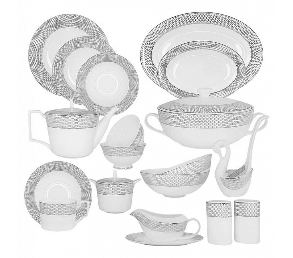 Столово чайный сервиз Севилья серебро Lenardi на 12 персон 105 предметов изготовлен из тончайшего и очень прочного костяного фарфора. Сервиз декорирован геометрическим ультрамодным декором в виде серебряных нитей с платиновой окантовкой. Упакован в подарочную коробку. Сервиз имеет самую богатую комплектацию и содержит полный комплект всей необходимой сервировочной посуды для Вашего дома.Состав сервиза: