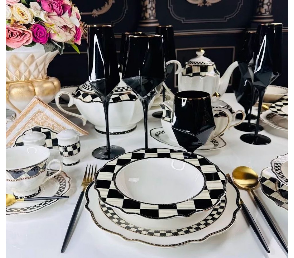 Столово-чайный сервиз Тристан Lenardi на 6 персон 38 предметов изготовлен из фарфора высочайшего качества. Черно-белый сервиз Тристан от Ленарди декорирован модным орнаментом "шашечки" в сочетании с золотой окантовкой. Упакован в подарочную коробку.Состав обеденного сервиза Тристан: