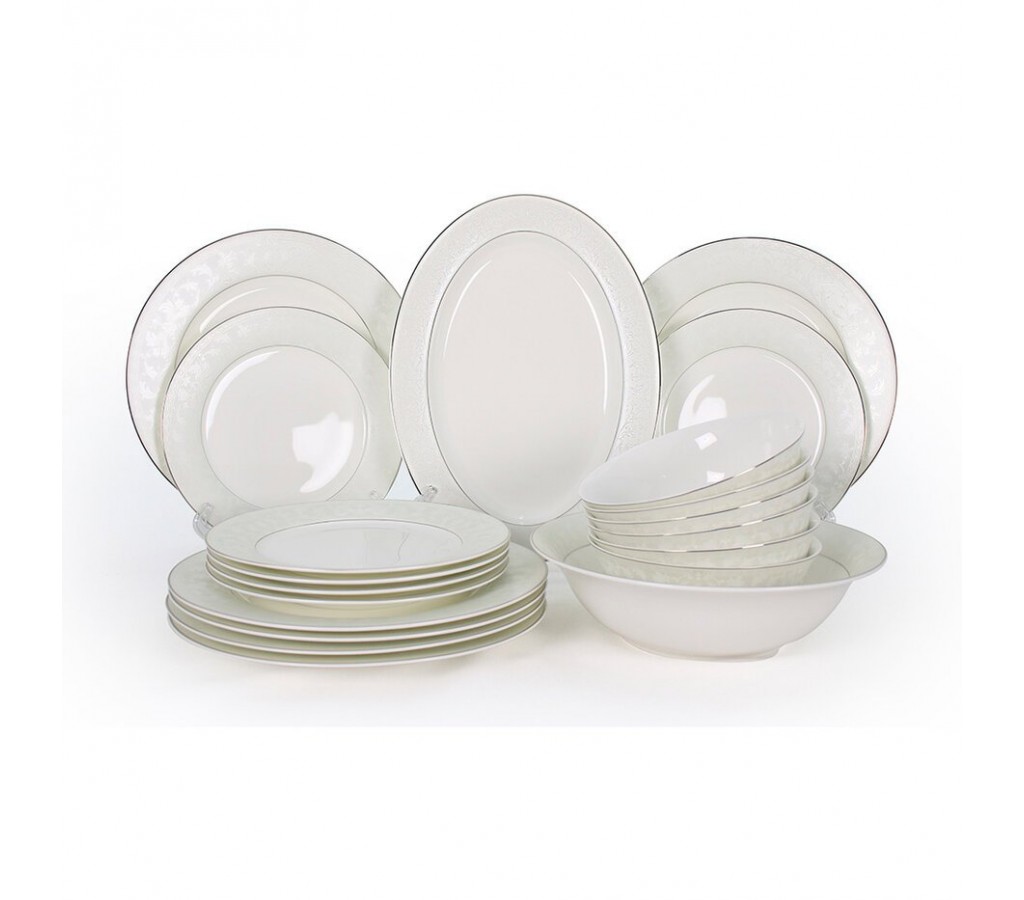 Обеденный сервиз Ариадна Акку включает всю необходимую посуду для сервировки стола на 6 персон. Тонкий рисунок в сочетании с белым золотом смотрится нежно и очень эяфектно. Все предметы сервиза декорированы белым золотом 18 карат (750 проба). По этому его нельзя использовать в микроволновой печи и посудомоечной машине.