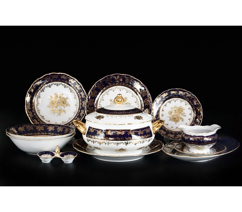 Комплектация Столового сервиза Офелия Золотая роза Кобальт Мелкий узор Старорольский Фарфор (MZ) на 6 персон 27 предметов: