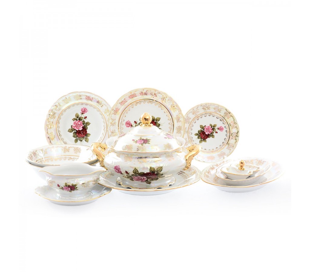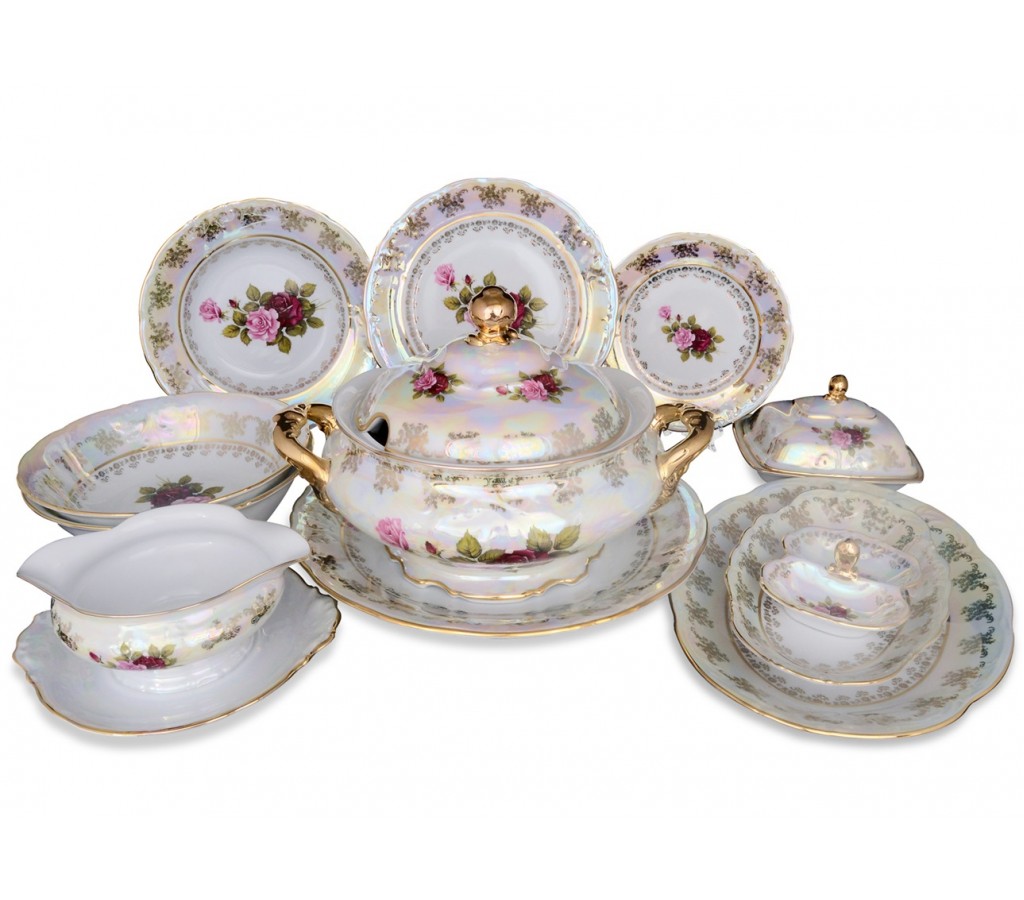 Знаменитый столовый сервиз Фредерика Роза перламутр известного бренда Карлсбад (Carlsbad) придаст праздничное настроение любому застолью. Изготовлен из чешского прочного белоснежного фарфора, покрытого перламутром, имеет рельефные тиснения. Декорирован изысканными нежно-розовыми и бардовыми бутонами роз с зелеными лепестками. Дизайн сервиза Фредерика Роза перламутр дополнен элегантным золотым растительным орнаментом.