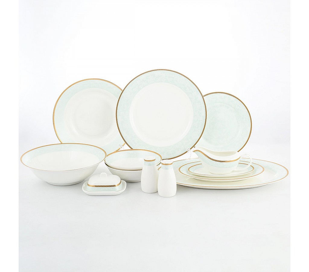 Нежный дизайн столового сервиза Жаклин от известного бренда Royal Classics придаст весеннее настроение любому застолью. Выполнен их высококачественного китайского фарфора, декорирован широкой бледно-бирюзовой лентой с белым растительным орнаментом на ней. По прямому краю посуды пущен золотой кант. Сервиз Жаклин прекрасно дополнит как праздничную сервировку стола, так и ежедневную сервировку для ужина в кругу семьи.