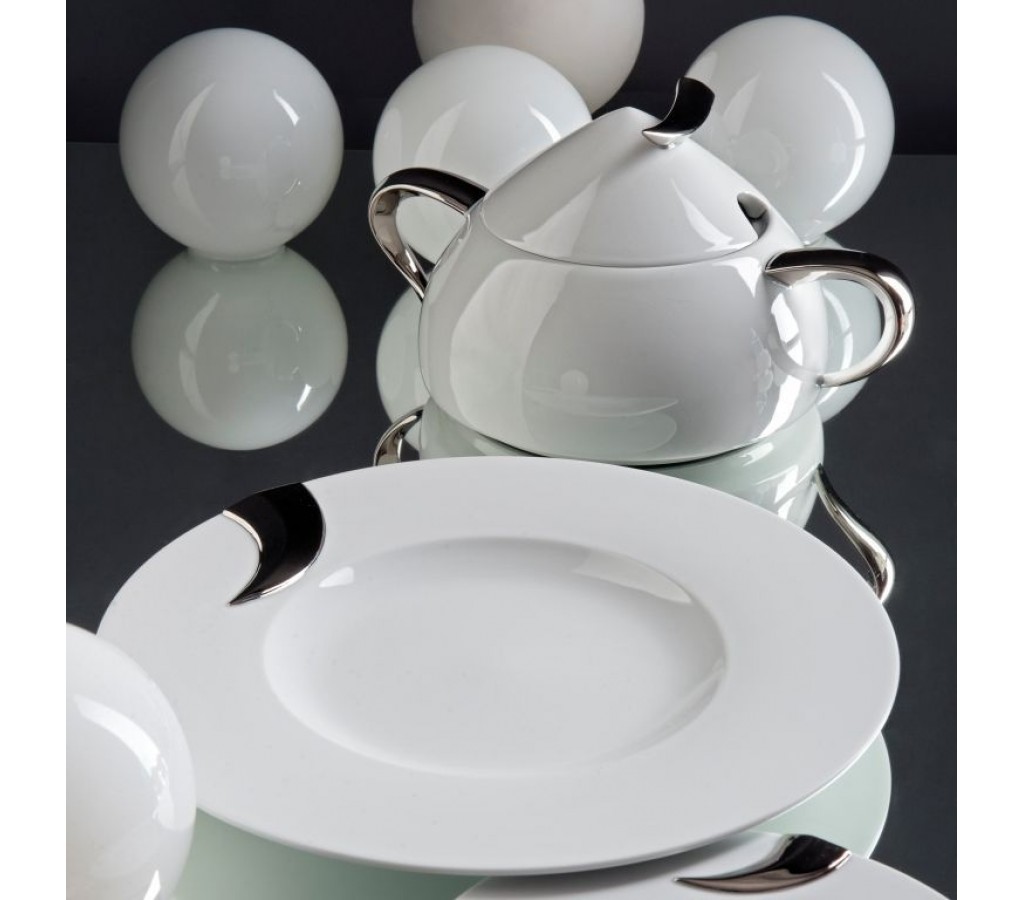 Неповторимый дизайн обеденного сервиза Кельт 1122 навеян кельтской историей. Основной декоративный элемент на тарелках и крышке супницы представляет украшение, аналогичное тому, какое было у кельтских воинов на брони шлема. Эти декоративные элементы покрыты платиной 950 пробы, а сам фарфор от известного чешского бренда Rudolf Kampf высочайшего качества.