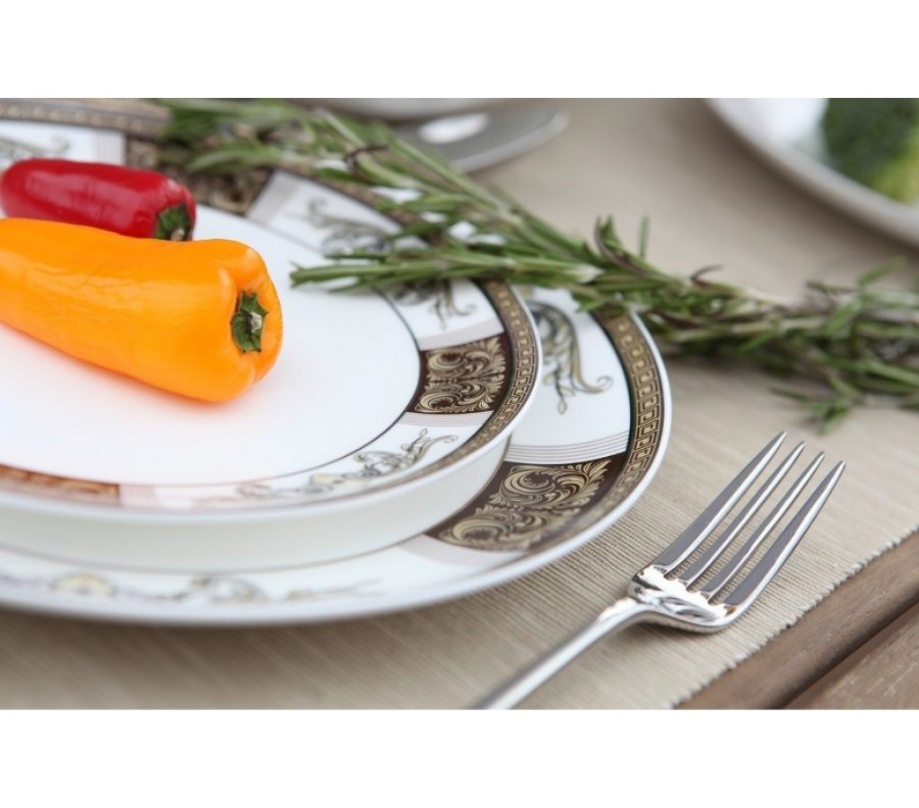 Тарелка плоская 20 см 6 шт., Тарелка плоская 25,5 см 6 шт., Тарелка суповая 19,5 см 6 шт., Салатник 15 см 6 шт., Блюдо с крышкой 1,65 л 1 шт., Блюдо прямоугольное 335x230 мм 1 шт., Блюдо овальное 310x220 мм 1 шт., Солонка 1 шт., Перечница 1 шт.