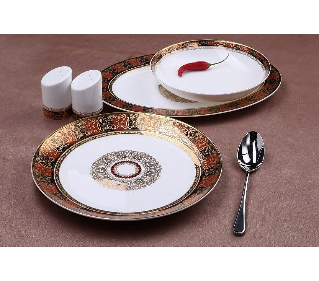 Тарелка плоская 25,5 см 6 шт., Тарелка плоская 20 см 6 шт., Тарелка суповая 19,5 см 6 шт., Салатник 15 см 6 шт., Блюдо с крышкой 1200 мл 1 шт., Блюдо прямоугольное 335x230 мм 1 шт., Блюдо овальное 310x220 мм 1 шт., Солонка 1 шт., Перечница 1 шт.