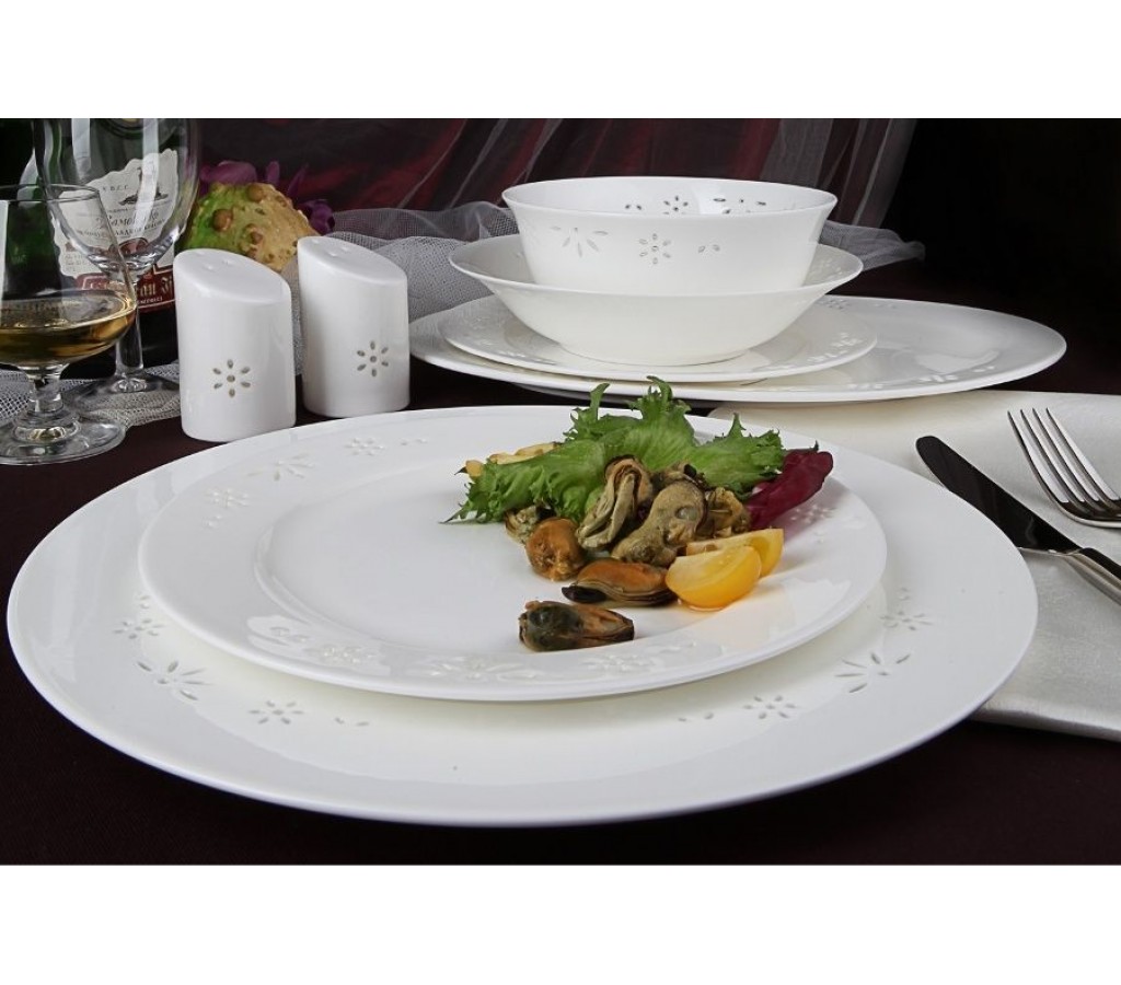 Тарелка плоская 27 см 6 шт., Тарелка плоская 20 см 6 шт., Тарелка суповая 19,5 см, 500 мл 6 шт., Салатник 15 см 6 шт., Блюдо овальное 31 см 1 шт., Солонка 1 шт., Перечница 1 шт.
