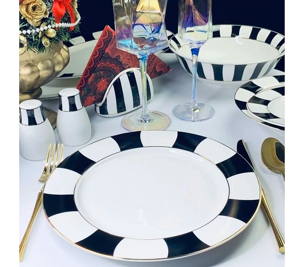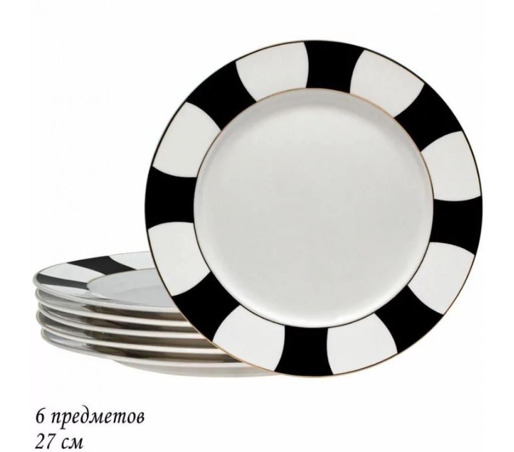 Набор из 6 тарелок 27 см Жаклин Lenardi изготовлен из фарфора высочайшего качества. Тарелки декорированы нестареющим и всегда актуальным контрастным черно-белым декором, удачно сочетающимся с золотой окантовкой. Упакован в подарочную коробку.Не рекомендуется использовать в микроволновой печи и мыть в посудомоечной машине, по причине возможного повреждения золотого декоративного покрытия.