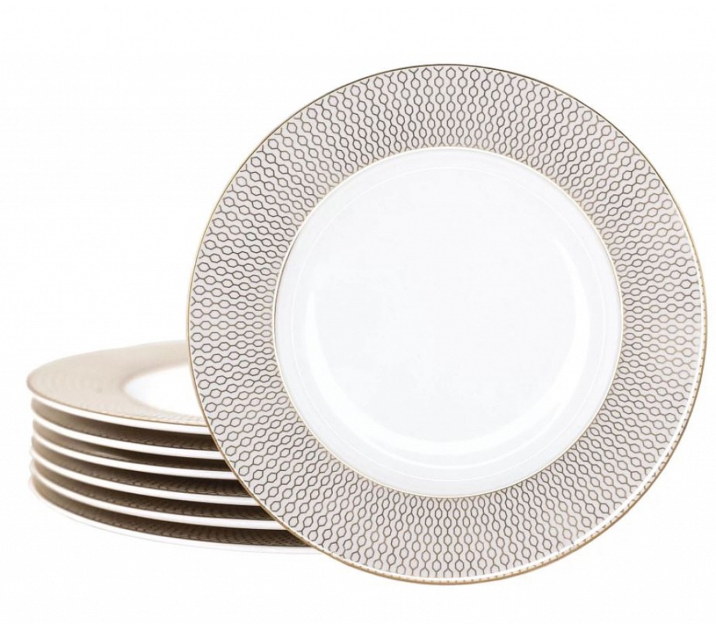 Набор из 6 подстановочных тарелок диаметром 27 см Севилья Lenardi изготовлен из тончайшего костяного фарфора. Набор декорирован геометрическим ультрамодным декором в сочетании с золотой окантовкой Упакован в подарочную коробку. Не рекомендуется использовать в микроволновой печи и мыть в посудомоечной машине, по причине возможного повреждения декоративного покрытия.