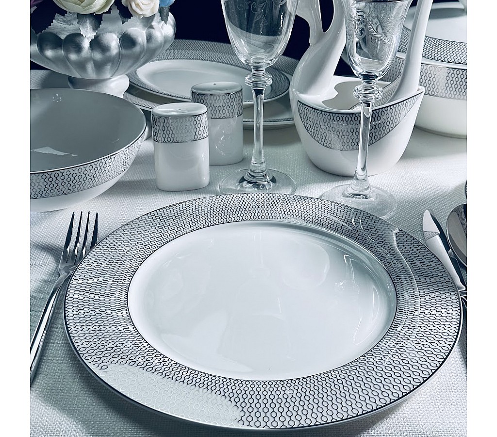 Набор из 6 подстановочных тарелок диаметром 27 см Севилья серебро Lenardi изготовлен из тончайшего костяного фарфора. Набор декорирован геометрическим ультрамодным декором в виде серебряных нитей с платиновой окантовкой и упакован в подарочную коробку. Не рекомендуется использовать в микроволновой печи и мыть в посудомоечной машине, по причине возможного повреждения декоративного покрытия.