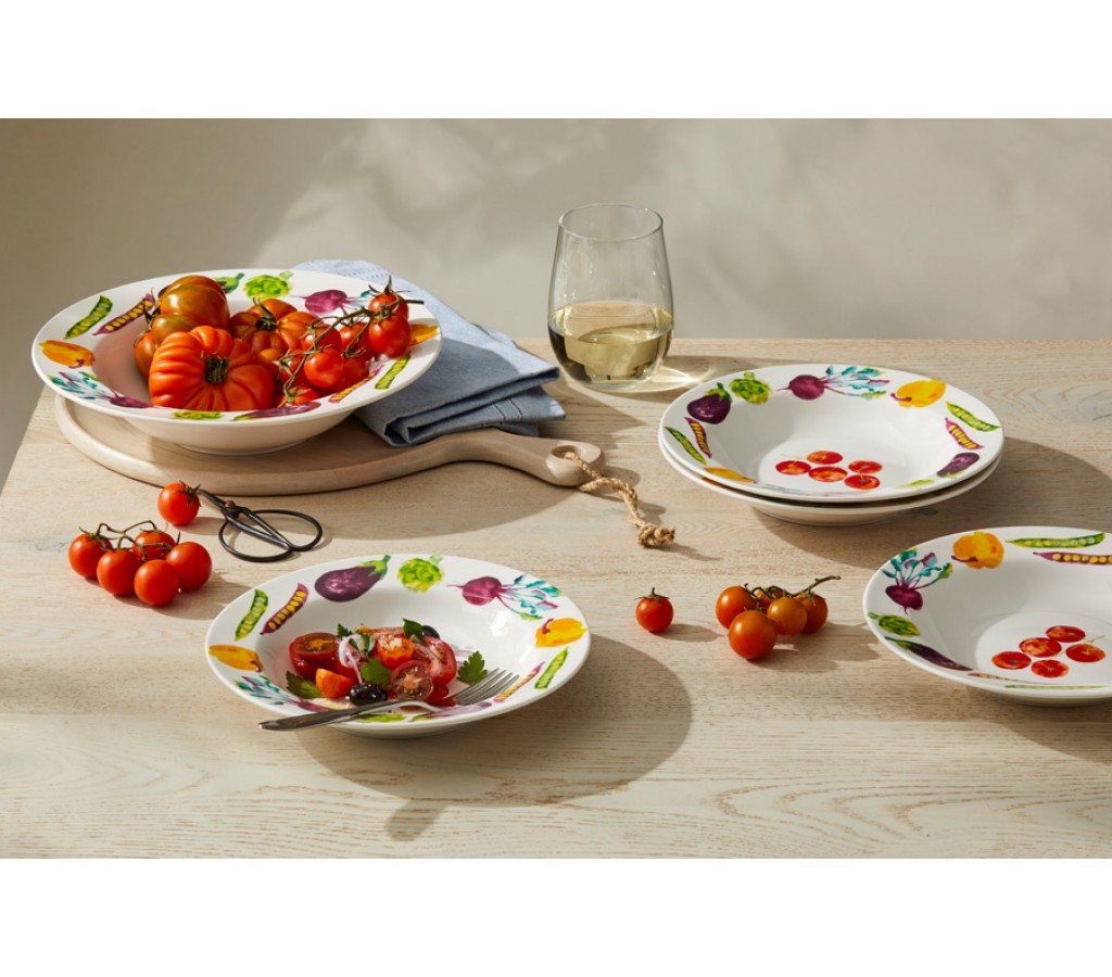 Набор для пасты Весенние овощи Casa Domani 5 предметов: 1 тарелка 27 см, 4 тарелки 22 см. Можно использовать в СВЧ и посудомоечной машине. Подарочная коробка.
