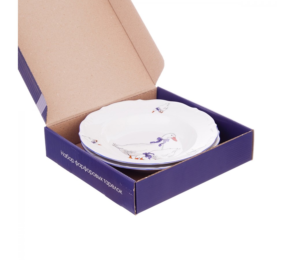 Набор классических тарелок коллекции Гуси Repast это идеальное решение для подачи первого блюда ,имеют диаметр 23 см и оптимальный объем 300мл.Тарелки пригодны для использования с ПМ машине и микроволновой печи.Изготовлены из прочного,износостоикого европейского фарфора.