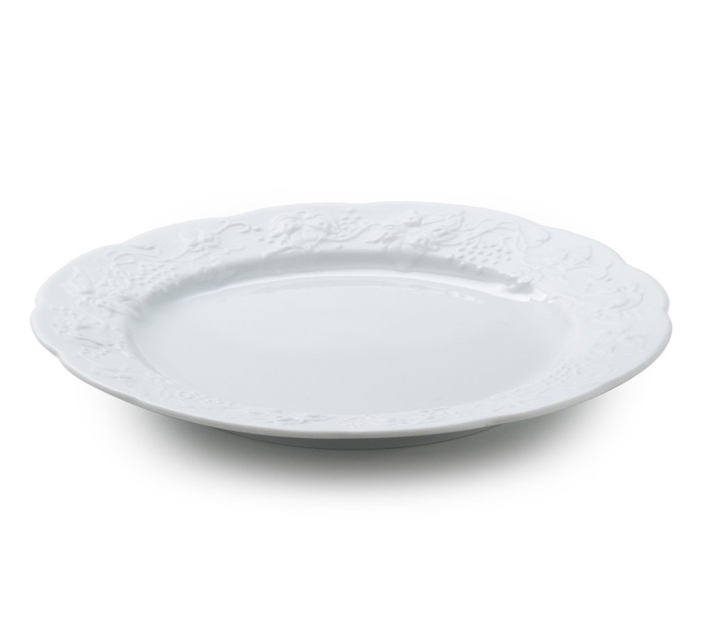 Тарелка произведена из белоснежного лиможского фарфора и декорирована рельефным рисунком в виде гроздей винограда.