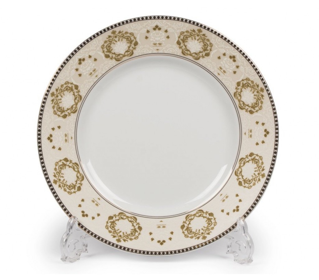 Большая тарелка из колекции Raid OR произведена из белоснежного лиможского фарфора и декорирована золотым орнаментом на бежевом фоне. Эта посуда универсальна, она будет прекрасно смотреться как на повседневном, так и на праздничном столе.