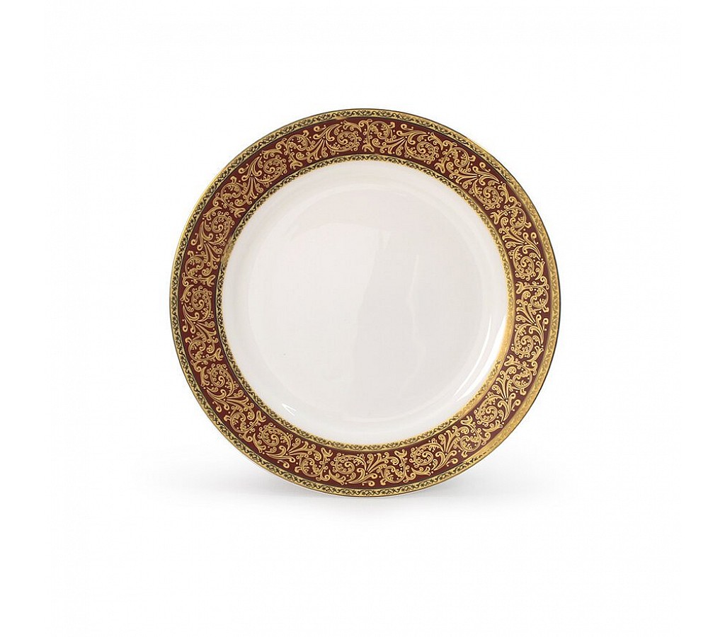 Тарелка подстановочная Триумф 25,5 см декорирована золотым витиеватым узором (золото 18 карат 750 проба) на красном фоне. Не рекомендуется мыть тарелку в посудомоечной машине и использовать в микроволновой печи.