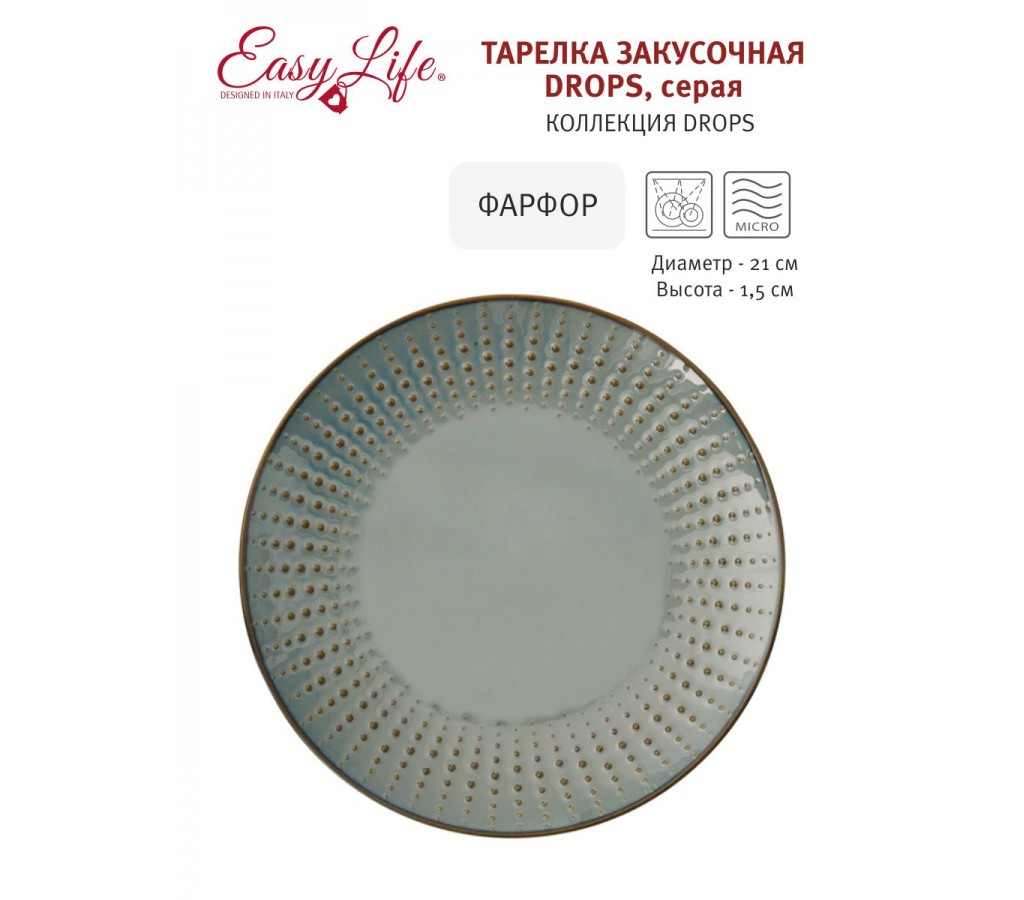 Тарелка закусочная Drops серая Easy Life 21 см без упаковки. Мыть теплой водой с применением ЖМС. Можно использовать в СВЧ и посудомоечной машине.