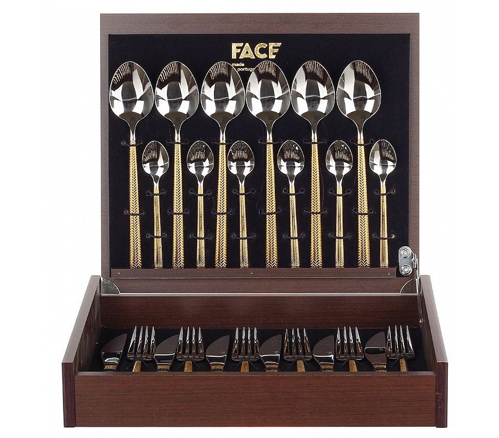 Набор столовых приборов Hera Gold Platina Face на 6 персон 24 предмета в деревянной, подарочной коробке - продукция известной португальской фабрики Face. Утонченные столовые приборы Face не деформируются, не подвергаются коррозии, не изменяют вкусовые свойства, запах и цвет пищи. Они производятся в Португалии под жестким контролем качества. Металл, используемый для создания столовых приборов бренда Face, – нержавеющая сталь. В материале содержится 18 % хрома и 10 % никеля. Такое процентное соотношение химических элементов обеспечивает достаточную прочность готовых изделий. Столовые приборы Face выполнены по уникальному дизайну и оформлены в красивые подарочные упаковки. Стильные изделия можно смело использовать для сервировки праздничного стола. Набор пригоден для мытья в ПМ.