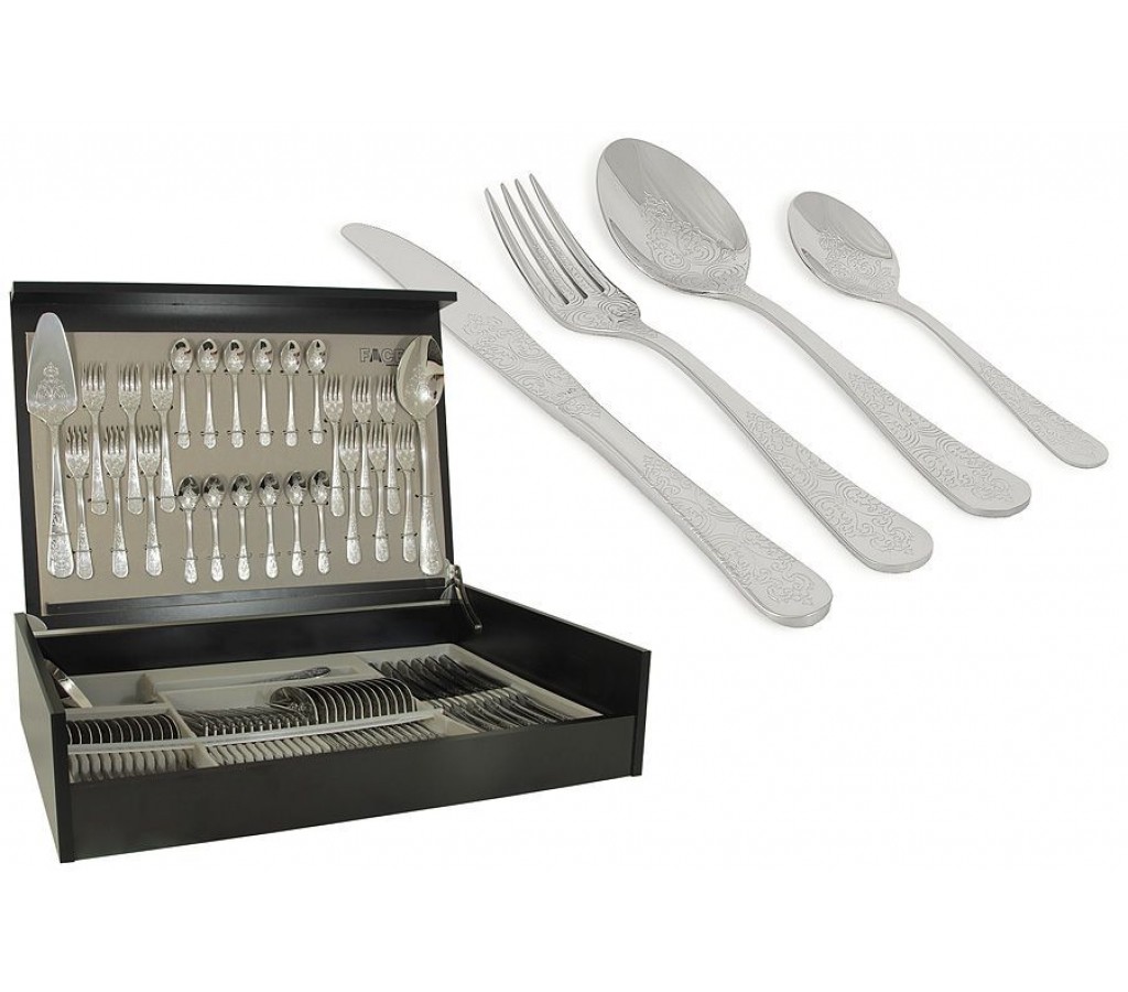 Набор столовых приборов 75 предметов на 12 персон из коллекции Antique Mirror португальского производителя Face упакован в деревянный подарочный короб.Столовые приборы FACE изготавливаются из высококачественной стали марки 18/10 с полным соблюдением технологии, что позволяет сохранять первоначальный вид предметов в течение многих лет. После каждого использования удалите остатки пищи со столовых приборов, не оставляя их на долгое время, Рекомендуется ручная мойка губкой или мягкой тканью под горячей водой с использованием нейтральных моющих средств. При мытье в посудомоечной машине избегайте агрессивных (абразивных) порошков, рекомендуется использовать режим с предварительным замачиванием.
