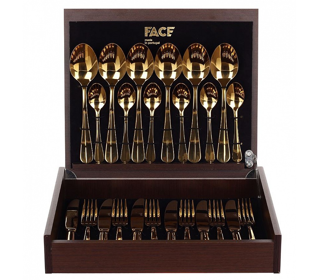 Набор столовых приборов Baguette Gold Face на 6 персон 24 предмета в деревянной, подарочной коробке - продукция известной португальской фабрики Face. Утонченные столовые приборы Face не деформируются, не подвергаются коррозии, не изменяют вкусовые свойства, запах и цвет пищи. Они производятся в Португалии под жестким контролем качества. Металл, используемый для создания столовых приборов бренда Face, – нержавеющая сталь. В материале содержится 18 % хрома и 10 % никеля. Такое процентное соотношение химических элементов обеспечивает достаточную прочность готовых изделий. Столовые приборы Face выполнены по уникальному дизайну и оформлены в красивые подарочные упаковки. Стильные изделия можно смело использовать для сервировки праздничного стола. Набор пригоден для мытья в ПМ.