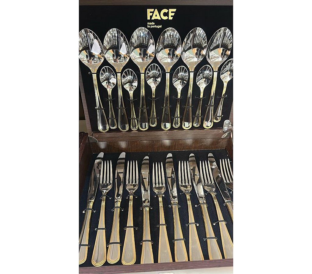 Набор столовых приборов Desna Gold Face на 6 персон 24 предмета в деревянной, подарочной коробке - продукция известной португальской фабрики Face. Утонченные столовые приборы Face не деформируются, не подвергаются коррозии, не изменяют вкусовые свойства, запах и цвет пищи. Они производятся в Португалии под жестким контролем качества. Металл, используемый для создания столовых приборов бренда Face, – нержавеющая сталь. В материале содержится 18 % хрома и 10 % никеля. Такое процентное соотношение химических элементов обеспечивает достаточную прочность готовых изделий. Столовые приборы Face выполнены по уникальному дизайну и оформлены в красивые подарочные упаковки. Стильные изделия можно смело использовать для сервировки праздничного стола. Набор пригоден для мытья в ПМ.